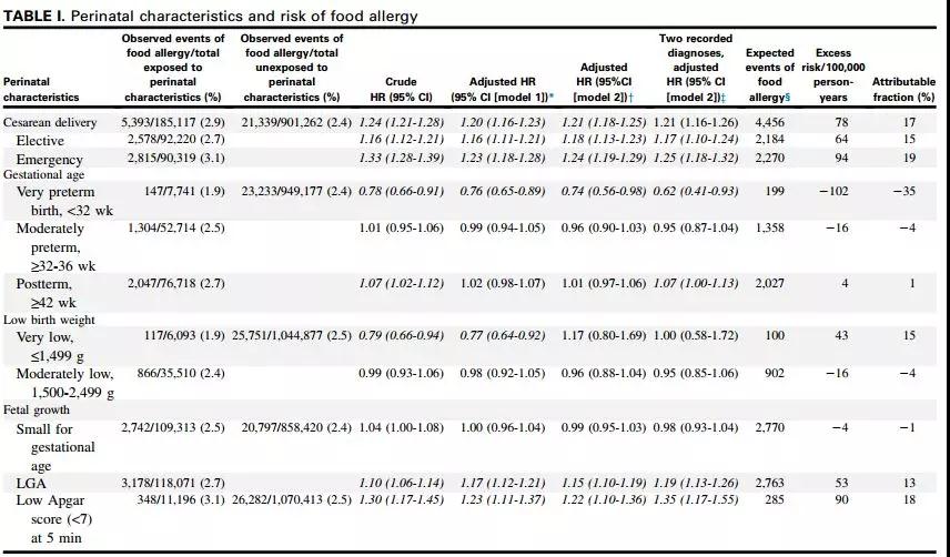 结论:剖腹产与食物过敏风险增加相关,而极早产降低了风险。
