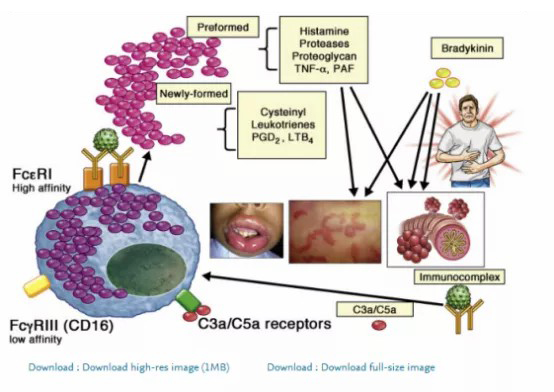 IgE介导通路由过敏原启动,当过敏原与特异性IgE抗体结合时,导致肥大细胞(MC)和嗜碱性细胞上的高亲和性IgE受体(FcεRI)发生交联并启动信号级联,释放包括组胺在内的介质,以及预形成的细胞因子和蛋白酶,以及合成和分泌额外的细胞因子和脂质介质,如血小板激活因子(PAF)、白三烯和前列腺素。典型的过敏反应途径是适应性免疫的一个例子。对过敏原过敏反应的临床诊断是基于这种IgE范式的。当使用免疫调节治疗(如免疫疗法或抗IgE)时,对特定过敏原的IgE水平高与疾病严重或持续时间长有关,也与治疗失败有关。然而,有相当一部分经历过过敏反应的患者并没有出现IgE依赖性免疫激活的任何证据。在这些患者中,没有迹象表明IgE介导的MC或嗜碱性粒细胞激活,如皮肤试验阳性结果、存在过敏原特异性IgE或组胺升高。在一些患者中,根本没有MC激活的证据,例如,他们有正常的胰蛋白酶。所有这些数据表明存在其他潜在的机制。