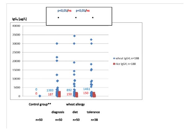 We compared 388 each wheat and rice sIgG and sIgG4 in a group of 200 children: 50 WA (diagnosis, diet treatment, tolerance), 50 CD (diagnosis and remission), 50 HP and 50 healthy. SIgE, sIgG, sIgG4 were determined with the FEIA method (Pharmacia CAP System).